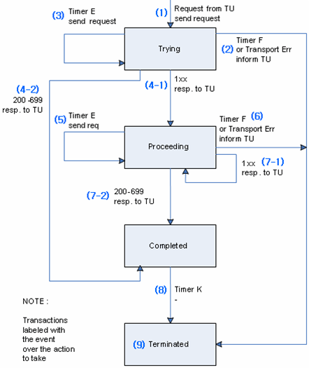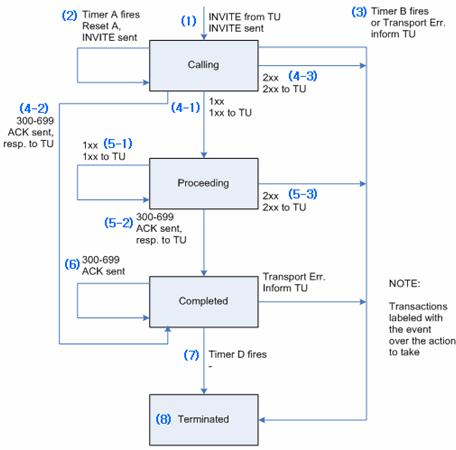 (8) 일단 client transaction이 Completed 상태가 되면 즉시 Timer K가 비신뢰성 전송 프로토콜인 UDP일 경우 T4초로 설정되어 구동되고, 신뢰성 프로토콜인 TCP/SCTP를 사용할 경우 0초로 설정되어 구동된다. 이후 client transaction 상태는 Terminated 상태로 천이된다.