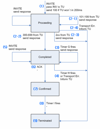 (5) Completed 상태에서 UAC로부터 INVITE 를 재수신할 수 있다. 이는 client가 INVITE에 대한 provisional response를 수신하지 못했거나, 재전송 timer가 expire되어 INVITE를 재전송한 이후에 reponse를 수신한 경우로 볼 수 있다.