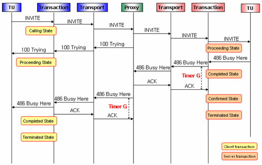 상기의 그림에서와 같이 INVITE에 대한 300~699 reponse에 대한 ACK는 client transaction에서 생성하고 전송한다. non-2xx response에 대한 ACK는 hop-by-hop 으로 처리하며, ACK를 수신하지 못할 경우 failure response 재전송은 server transaction이 제어한다.